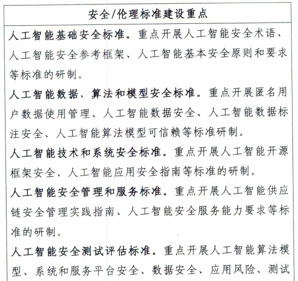 1.安全與隱私保護標準。包括基礎安全,數(shù)據、算法和模型安全,技術和系統(tǒng)安全,安全管理和服務,安全測試評估,產品和應用安全等六個部分。