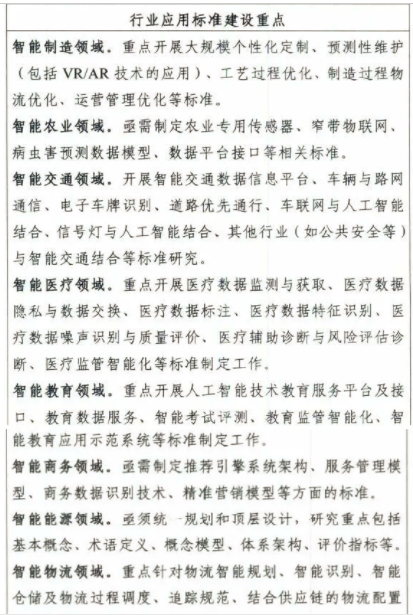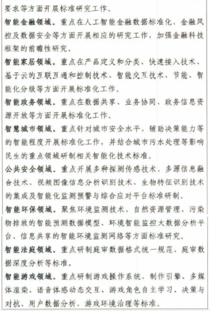 到2023年,初步建立人工智能標準體系,重點研制數(shù)據、算法、系統(tǒng)、服務等重點急需標準,并率先在制造、交通、金融、安防、家居、養(yǎng)老、環(huán)保、教育、醫(yī)療健康、司法等重點行業(yè)和領域進行推進。建設人工智能標準試驗驗證平臺,提供公共服務能力。