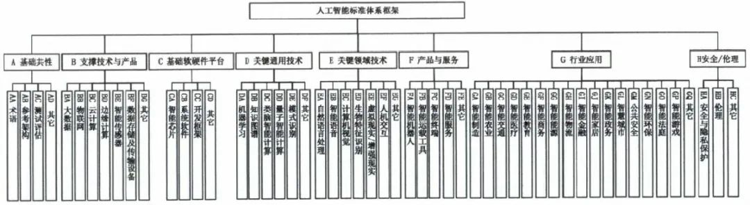 其中,A基礎共性標準包括術語、參考架構、測試評估三大類,位于人工智能標準體系結構的最左側,支撐標準體系結構中其它部分;