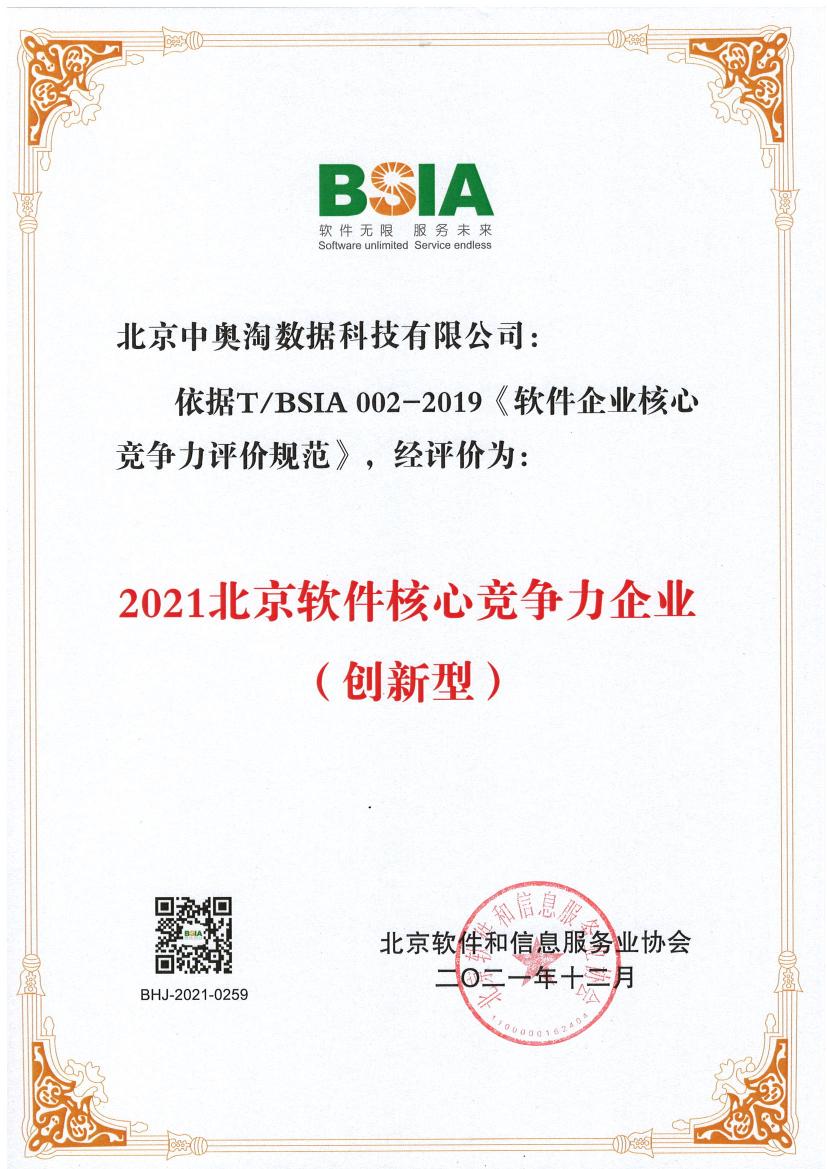據(jù)悉,北京軟件和信息服務(wù)業(yè)協(xié)會依據(jù)《軟件企業(yè)核心競爭力評價(jià)規(guī)范》團(tuán)體標(biāo)準(zhǔn),開展核心企業(yè)競爭力評價(jià)活動,并采用統(tǒng)計(jì)性評價(jià)和行業(yè)專家評議相結(jié)合的方法,從企業(yè)規(guī)模、經(jīng)營業(yè)績、研發(fā)能力、創(chuàng)新成果、質(zhì)量保證五個(gè)維度進(jìn)行嚴(yán)格評審。北京中奧在政務(wù)大數(shù)據(jù)以及人工智能領(lǐng)域的產(chǎn)品和技術(shù)能力得到認(rèn)可,獲評企業(yè)核心競爭力評價(jià)(創(chuàng)新型)。