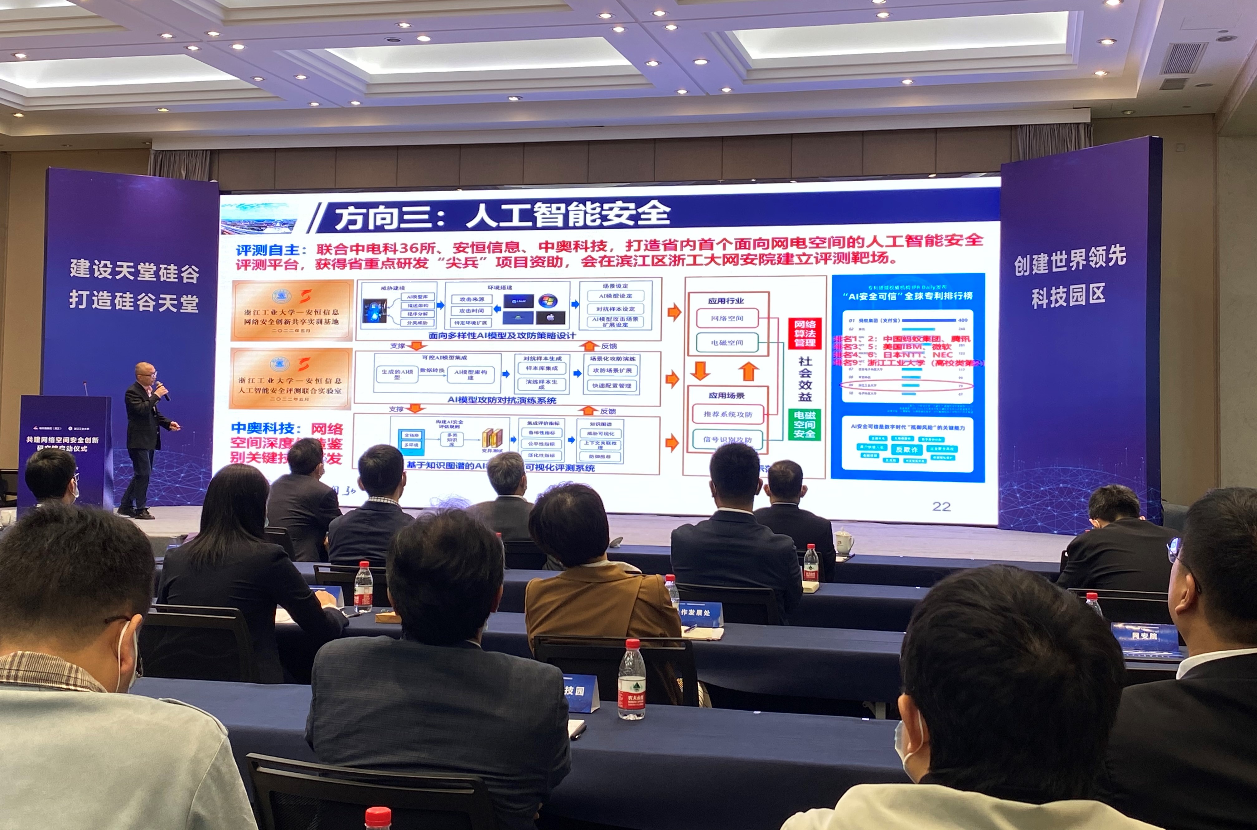 中奧科技副總裁張亮與濱江區(qū)浙工大網(wǎng)安院院長宣琦就“人工智能網(wǎng)絡(luò)安全·深度偽造鑒別技術(shù)研發(fā)聯(lián)合技術(shù)攻關(guān)"進行簽約。
