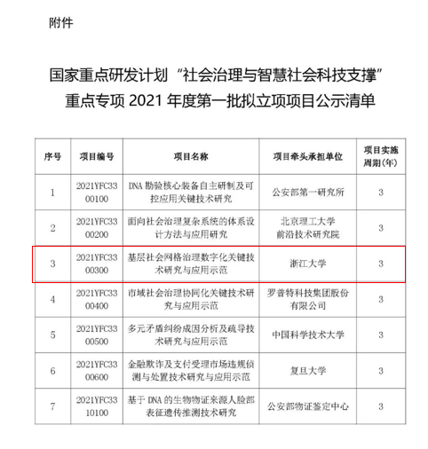 由浙江大學牽頭的“基層社會網絡治理數字化關鍵技術研究與應用示范”項目獲批成為2021年第一批國家重點研發計劃“社會治理與智慧社會科技支撐”重點專項。項目圍繞“社會治理新模式、社會治理要素、時空大數據關聯方法、社會多元感知技術、事件管理、人員畫像軌跡、社會基層網格治理示范“等目標進行研究。
